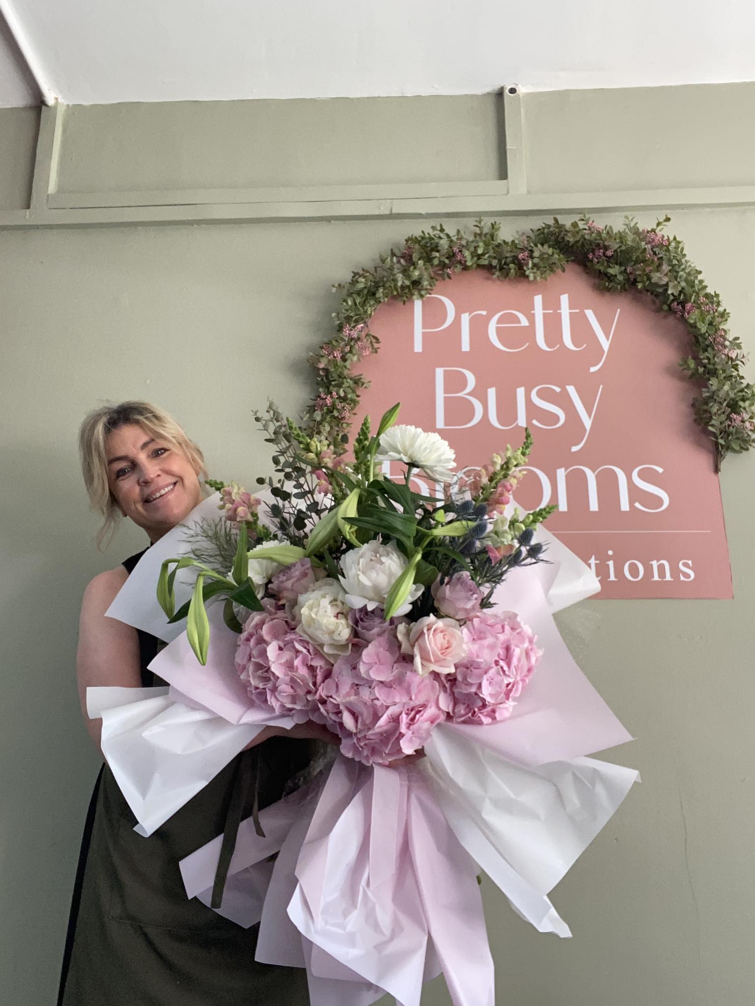 35-40 Stems including Pink rose, White Rose, Pink Alstroemeria, Purple Dracaena Compacta, Eucalyptus Parvi, modern chrysanths, Limonium and Hypericum.